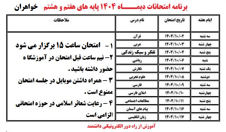 برنامه امتحانات داخلی دیماه هفتم و هشتم واحد خواهران