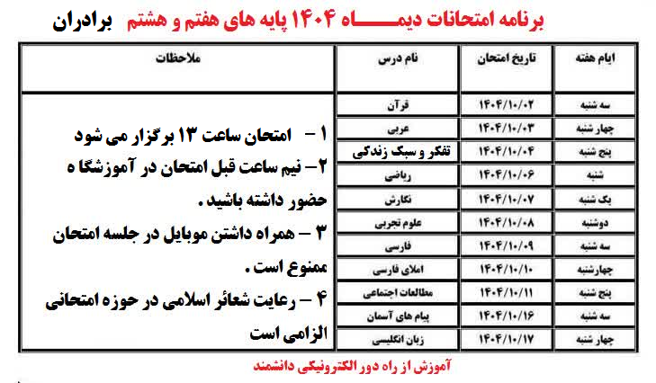 برنامه امتحانات داخلی دیماه هفتم و هشتم واحد برادران