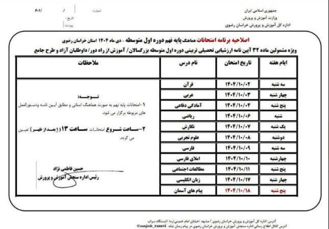 برنامه امتحانات پابه نهم دیماه 1404 خواهران