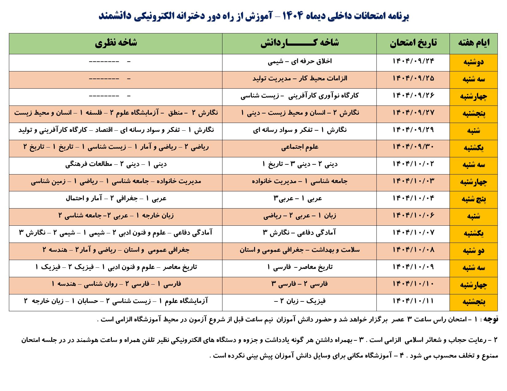 برنامه امتحانات داخلی دیماه 1404 واحد خواهران